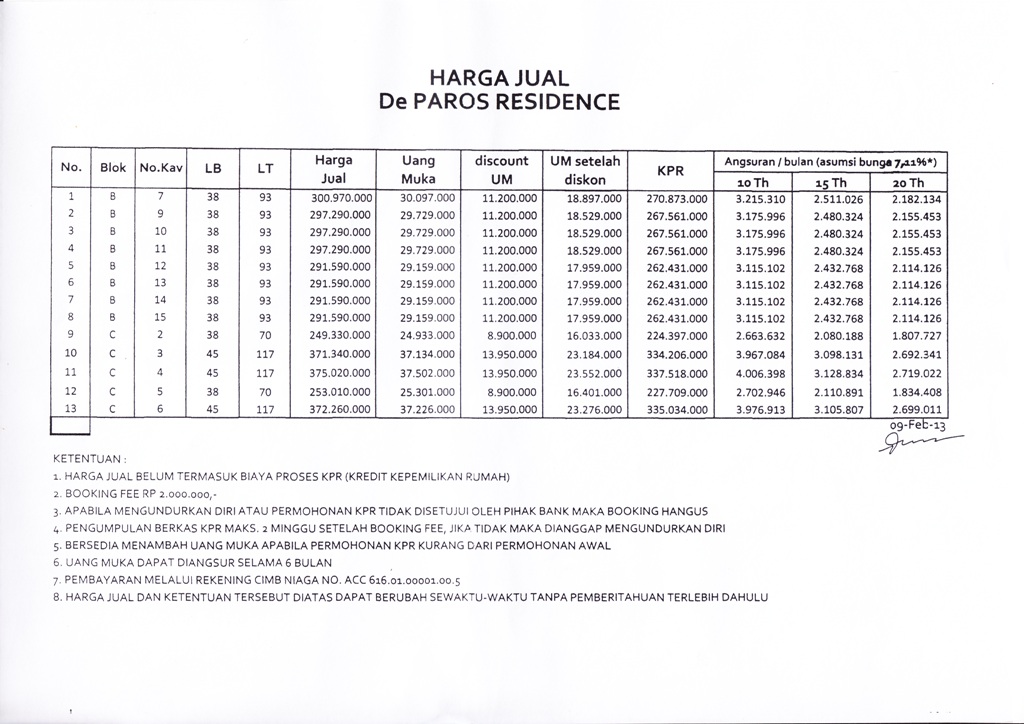 1. Kavling B-15 / type 38/93 / harga 360.100.000 / UM 24.810.000 / KPR 324.090.000 / cicilan 20 tahun 2.851.830