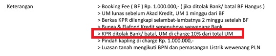 Dari gambar di atas, dijelaskan bahwa “Jika KPR DITOLAK, uang muka (UM) dikembalikan tetapi dipotong 10% dari UM yang sudah masuk ke developer”