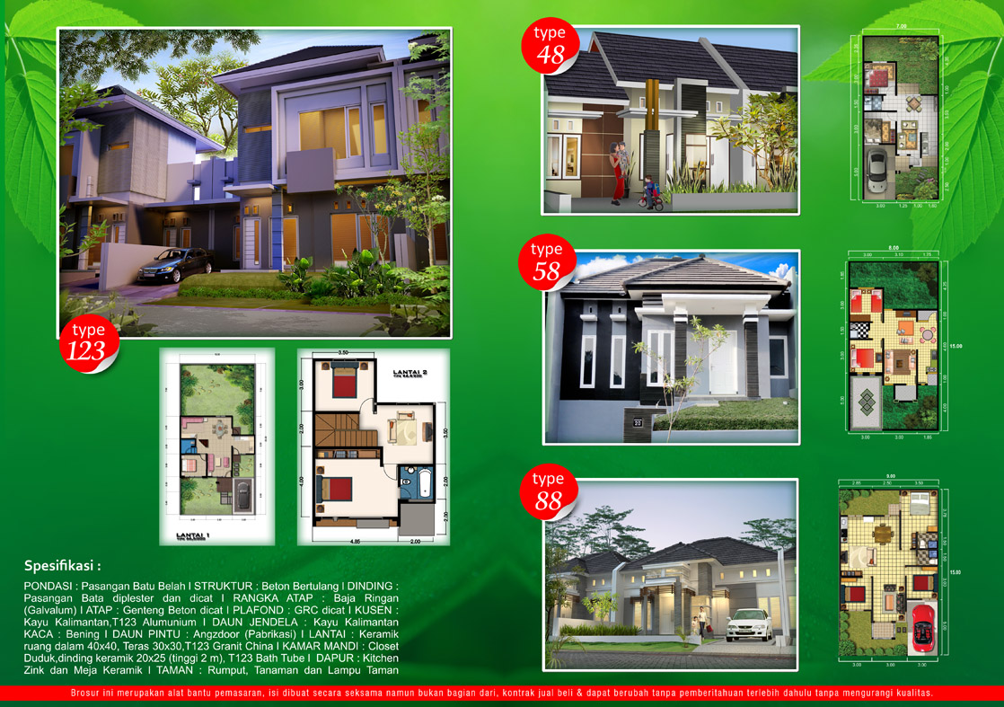 Dari brosur dapat kita lihat bahwa, perumahan ini bisa kita pesan sesuai desain kita (free design), yang penting sesuai dengan luas bangunannya.