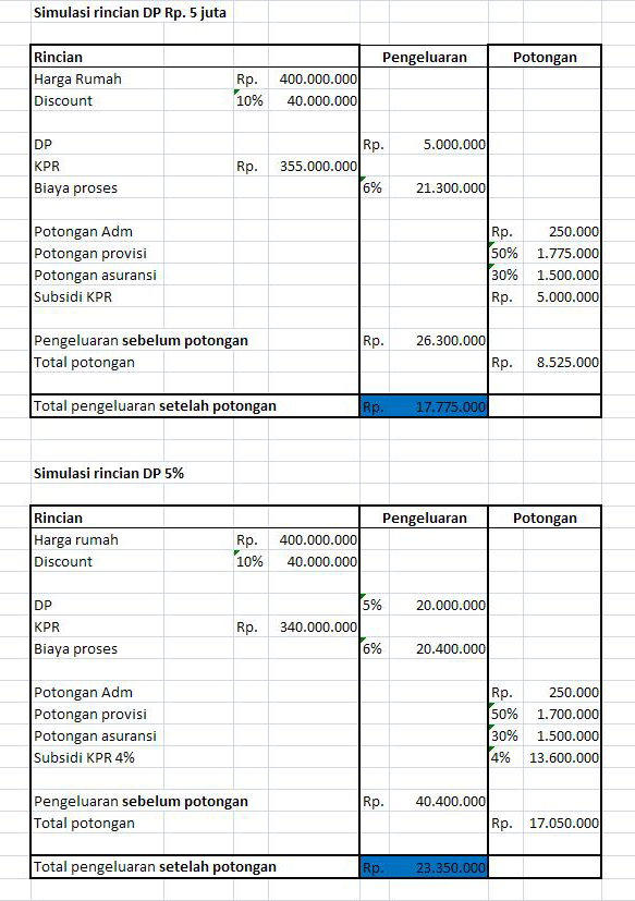 Misal harga Rp. 400 juta Normalnya DP + Biaya KPR = 80 juta + 16 juta = 96 juta.