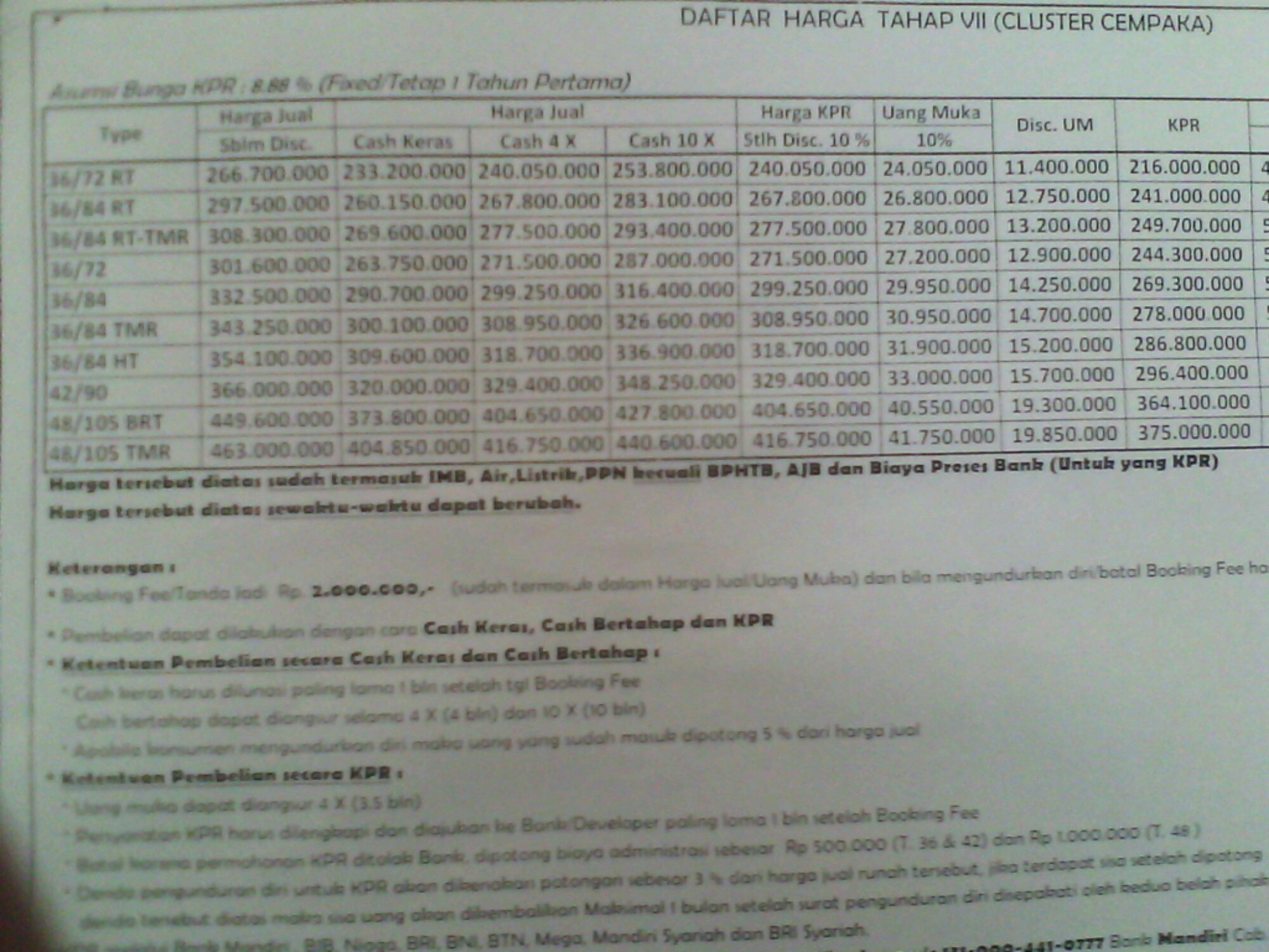 Tipe 48/105, harga 447,6 jt, UM 25,5 jt, cicilan 3,593 nt s.d 20 thn