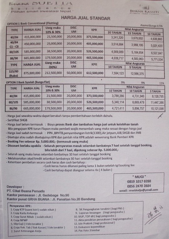 Lokasinya cukup strategis, karena Gedebage adalah salah satu kawasan prospek yang akan mengalami kemajuan beberapa tahun ke depan. Saat ini di lokasi tersebut sudah ada Stadion Bandung Lautan api yang akan memberikan nilai investasi tersendiri. Apalagi, sudah sering kita dengar bahwa lokasi ini akan diberikan akses pintu tol. Perumahan di Bandung Timur ini tergolong memiliki akses mudah, karena dilewati angkot (maaf Ipbblog gak hapal angkotnya hehe..). Memang beberapa bulan yang lalu saat Ipbblog coba melintas, tapi tidak survey, mengamati bahwa akses jalan masih rusak berat. Namun nampak sedang persiapan perbaikan jalan, yaitu pembetonan. Benar saja, 2 minggu yang lalau Ipbblog survey, jalannya sudah 90% selesai dibeton, kecuali ke arah ciwastra, masih 50% belum dibeton. Tipe-tipe yang ditawarkan adalah : – 40/84 mulai harga 415 juta, dengan UM (hanya) 20 juta, dan cicilan mulai 3,2 juta.- 60/105 – 86/90 – Ruko (115/60)