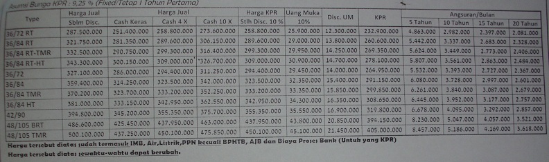Dengan dimulai dari tipe 36/72 harga mulai 287 jutaan, dengan UM hanya 14 jutaan dan cicilan mulai 2 jutaan selama 20 tahun. Tipe lainnya yang tersedia juga hingga tipe 48/105.