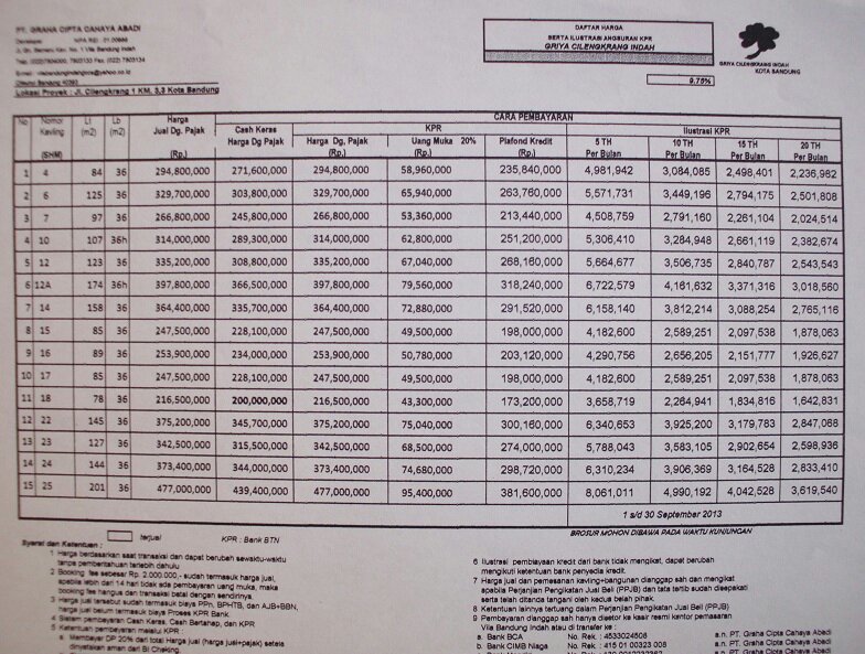 Berikut update harga terbaru perumahan di bandung timur, yang terletak di cilengkrang. Bagi yang berminat, bisa konfirmasi dulu di kantor pemasarannya yang berada di Jl. Gunung Semeru kav. 1, Vila Bandung Indah, Cileunyi.
