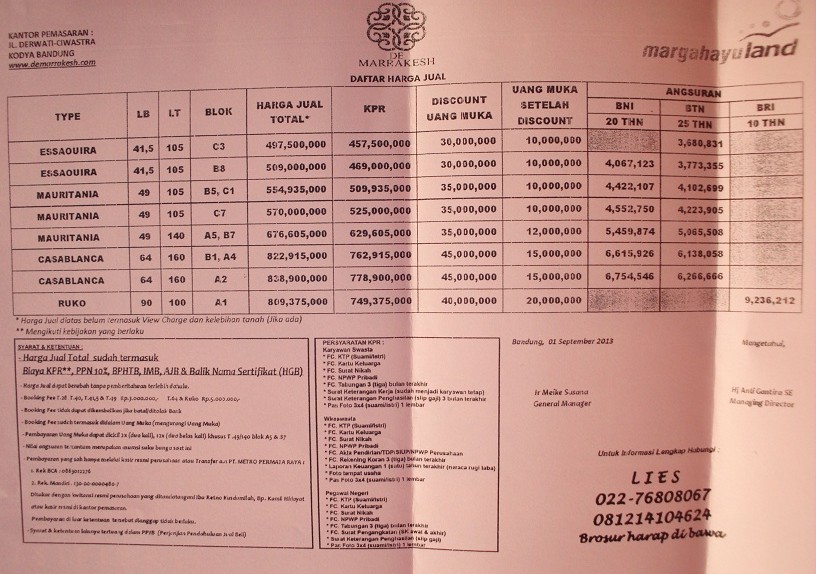Bagi yang memiliki penghasilan yang cukup besar, tapi belum ada uang muka. Salah satu pengembang ini, yaitu Margahayu Land, siap memberikan solusi, yaitu perumahan de Marrakesh, yang terletak di Jl. Derwati-Ciwastra. Image Dengan perumahan elite yang eksklusif, cukup bayar uang mulai 10 juta saja. Seperti yang sudah pernah Ipbblog bahas, perumahan ini memiliki banyak kelebihan, untuk lebih jelasnya klik di : https://infoperumahanbandung.wordpress.com/2013/05/10/de-marrakesh/ So.. bagi yang penghasilan per bulannya mencapai 12-18 juta, silahkan berburu rumah ini.. Ipbblog sangat merekomendasikan. Berikut Ipbblog berikan daftar cicilan terbarunya, Image Lokasi perumahan di Bandung timur ini akan mengalami perkembangan yang pesat, yaitu mulai dari sisi dekatnya dengan stadion bertaraf internasional, Bandung Lautan Api serta akan dibukanya pintu tol gedebage. Bagi yang minat, silahkan hub. 0812-1410-4624 022-7680-8067