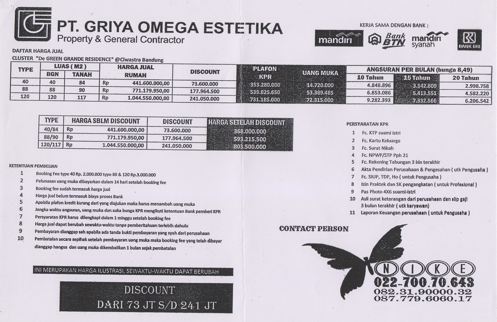 Tipenya dimulai dari tipe 40/84 hingga 120/117. Nah kalo lihat di spanduk harganya diskon gede-gedean, lengkapnya bisa dilihat di brosur di bawah. Sedang harga sebelum diskon adalah antar 441 juta, So.. jika KPR ternyata KPR sekitar 350 jutaan, cocok untuk karyawan yang berpenghasilan 9 jutaan 🙂