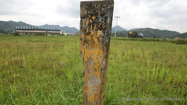 Nah karena rencana tol soroja ini sudah lama didengungkan, pastinya sudah ada lahan yang dibebaskan.. Salah satu gambar yang Ipbblog ambil dari pikiran-rakyat.com, ternyata ada patok yang letaknya dekat dengan stadion Si Jalak Harupat, gambar stadionnya saja kelihatan hehe