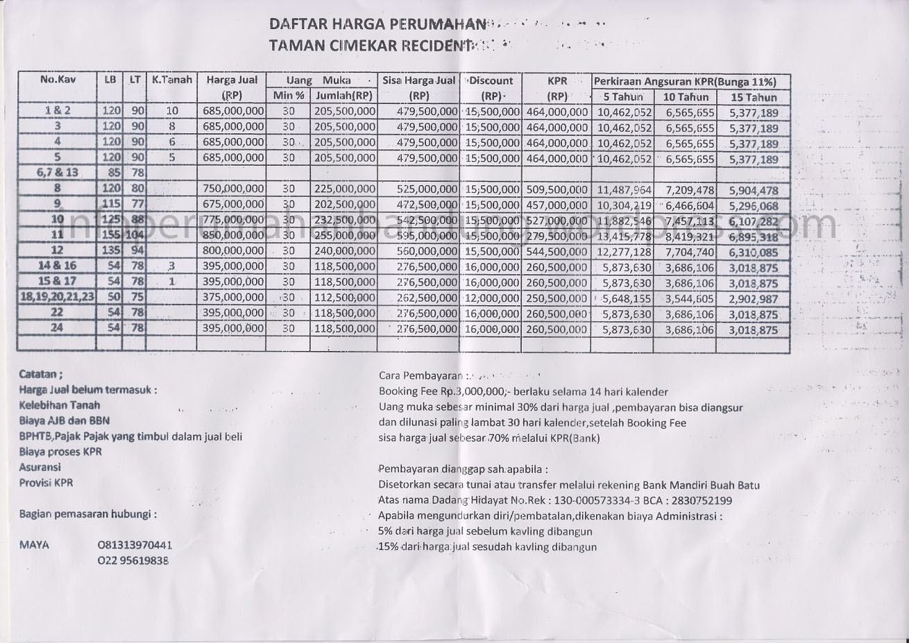 Wah padahal daerah cinunuk.. tapi harganya.. mulai 375 juta.. hehe, itu belum termasuk AJB, BBN, BPHTB, pajak dan dan biaya proses KPR. So.. bersiap-siap aja di angka minimal 400 juta. Dan.. banknya bebas.. bisa pakai bank apa aja, tapi mereka mensyaratkan DP 30%, artinya jika harga 400 juta, DP jatuh di atas 100 juta. sip.. 🙂 Yups.. langsung aja harganya..