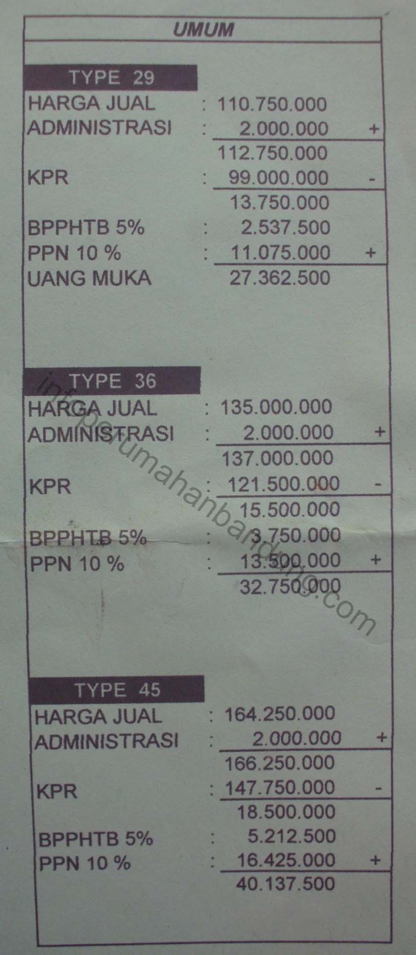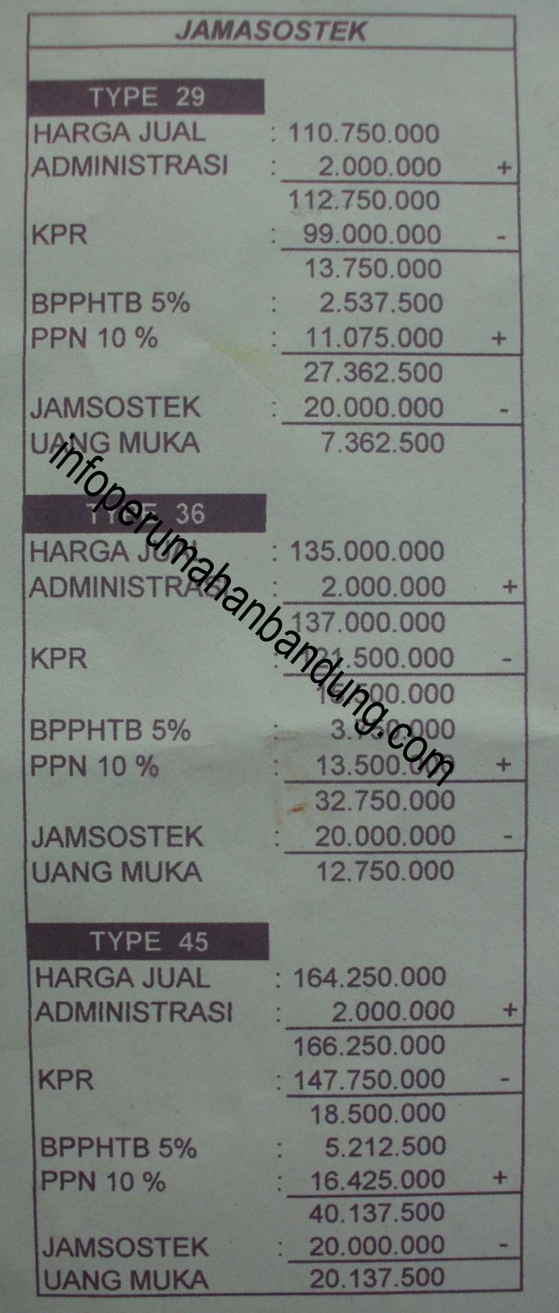 Dengan type 29/60, 36/72 dan 45/90 dimulai harga 110 juta bisa dengan menggunakan Jamsostek / tidak (umum).