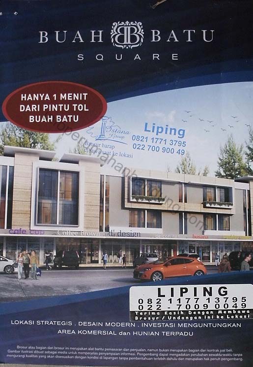 Istana Group, developer ternama, sudah berpengalaman lebih lama di Bandung dan sekitarnya dan sangat berpengalaman. Pasti pembaca Ipbblog tau Istana plasa ? atau Bandung Electronic Center (BEC) ? kalo perumahannya.. Istana Sudirman di Cijerah.. dan masih banyak lagi Mall dan perumahan yang Ipbblog gak hapal deh lokasi-lokasi yang disebutkan marketingnya. Saat ini.. mereka mempersembahkan Buah Batu Square, dengan konsep green.. ya.. green baik di luar rumah dan dalam rumah, yang dilengkapi dengan area komersil, seperti Mall dan Ruko..
