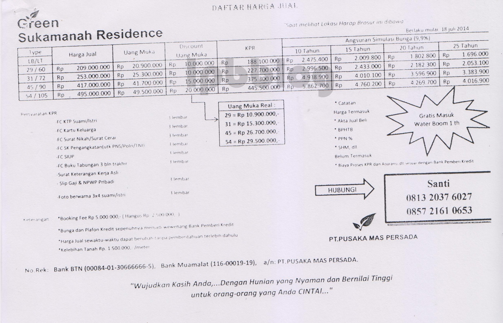 2. Yang terhormay Bapak Admin, Marketing yang di Brosur sudah resign, boleh dikonfirmasi. untuk Info Green Sukamanah Bisa Hubungi Saya di : MIFTAH