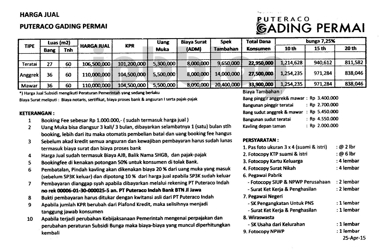 Belum sampai sebulan yang lalu ipbblog sudah dapat harga terbaru perumahan subsidi ini, namun harga resmi akhir april 2015 untuk unit teratai sudah naik lagi, hanya saja cicilannya malah turun 😀