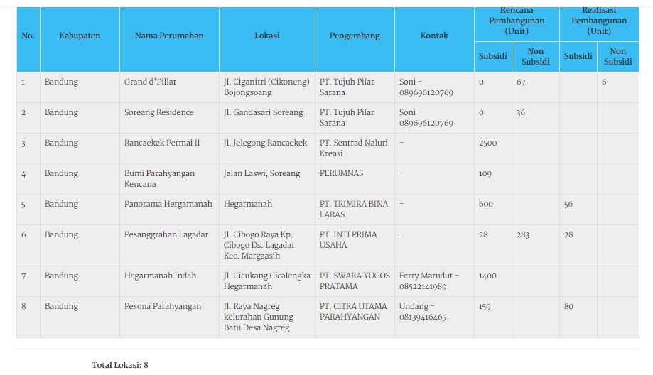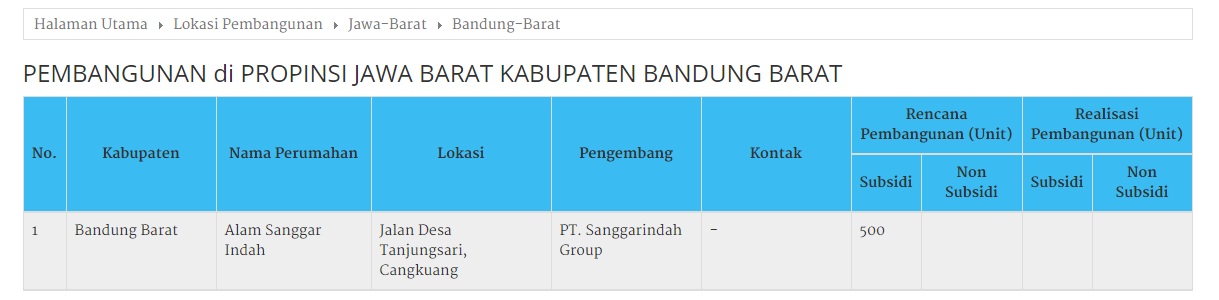Kemudian lanjut ke Kabupaten Bandung Barat, dan isinya benar.. tapi sayangnya hanya ada 1 perumahan, yaitu Alam Sanggar Indah. Bahkan unit dijualnya hanya 500 unit, padahal yang ipbblog tahu total unitnya mencapai (rencana) 3000 unit, tapi memang tidak semua subsidi, namun ipbblog bisa perkirakan 60% (hanya perkiraan ya..) adaah subsidi.
