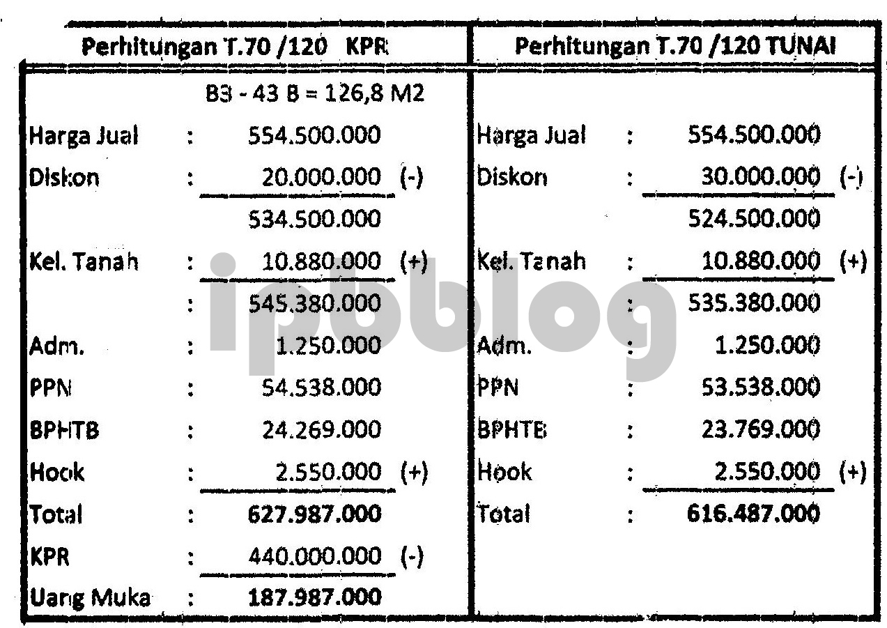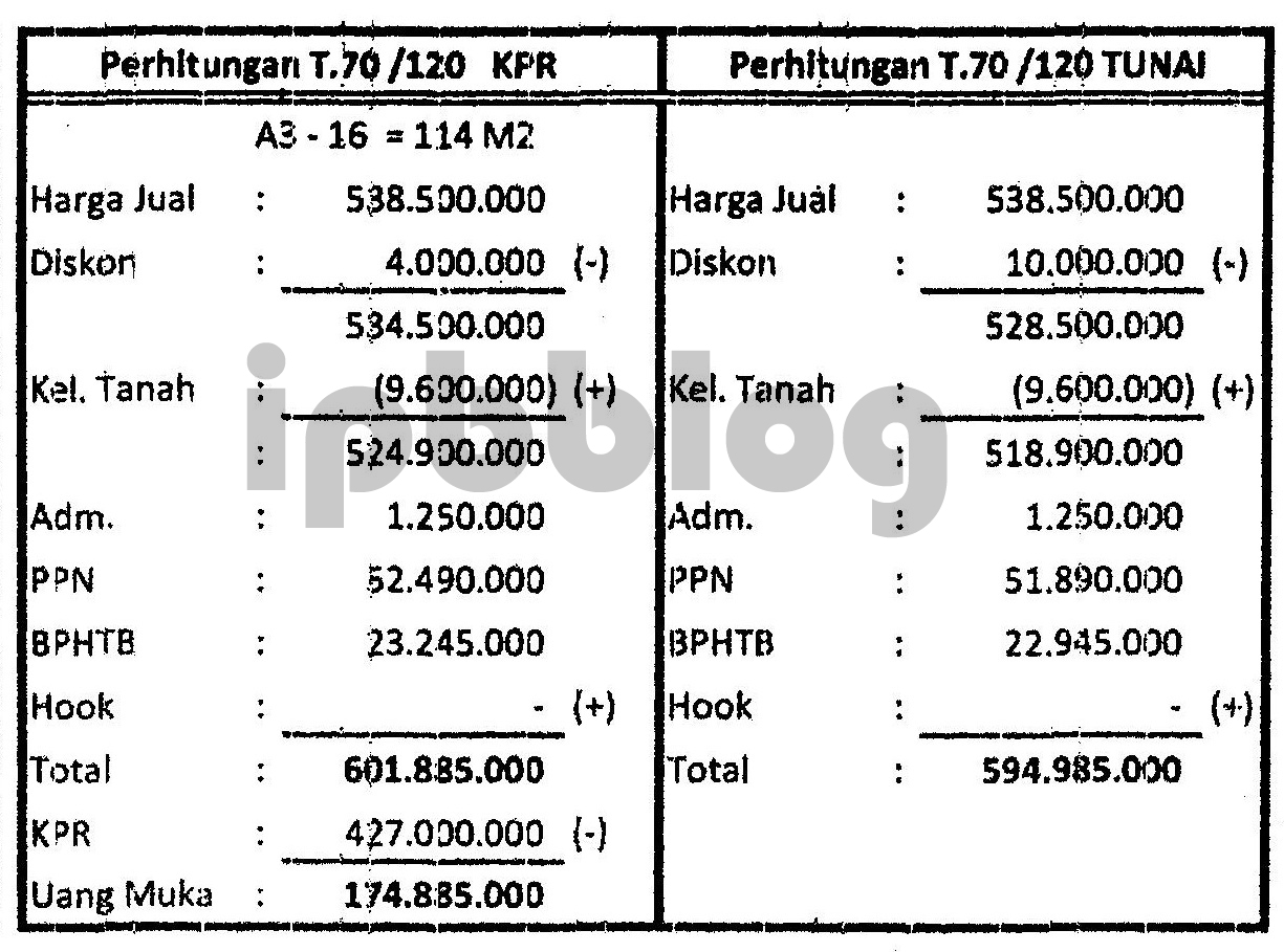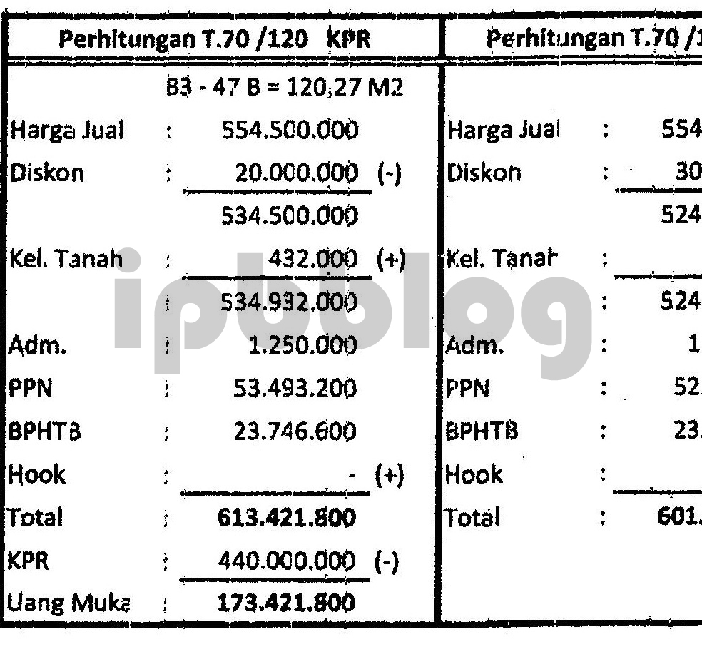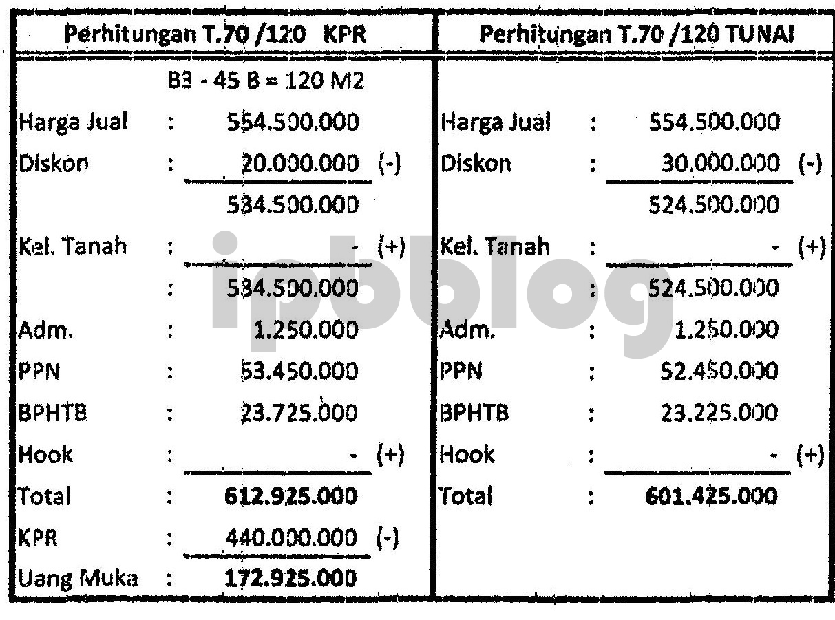 Harga jualnya pun 500 jutaan, hampir sebanding dengan tipe 45 lainnya di daerah Bandung Timur. Walau pun terlihat “murahnya” harga tsb, tapi perlu dilihat juga mekanisme detail uang mukanya, karena pada brosur tertera tulisan belum termasuk pajak-pajak. Maka bisa dilihat pada gambar di bawah,