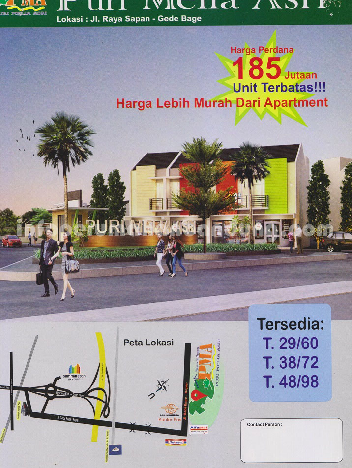 Tipe mulai tersedia 29/60 ; 38/72 ; 48/98, dengan harga mulai dari 185 jutaan. Apalagi Daerah Gedebage yang diperkirakan sekitar maksimal 10 k m saja dari lokasi bisa dikategorikan dekat dengan kota Teknopolis Gedebage.