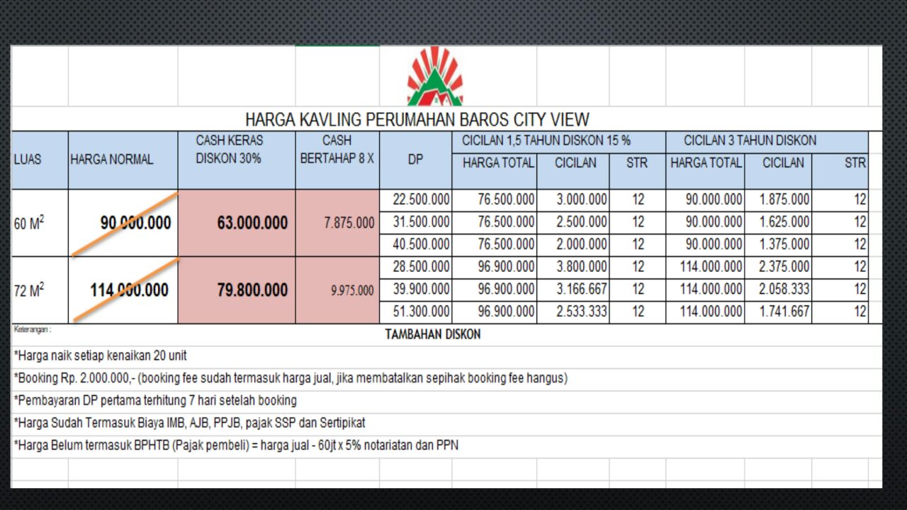 Luas tanah 60 m2, harga cash 63 juta ; harga KPR 3 tahun 90 juta (cicilan 1,875 juta/bulan),