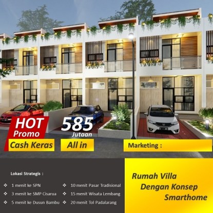 Rumah nuansa villa dengan konsep smarthome yang berada di pinggir jalan raya yang dilewati angkutan umum, bisa dimiliki dengan harga promo, harga perdana 700 juta 585 juta.