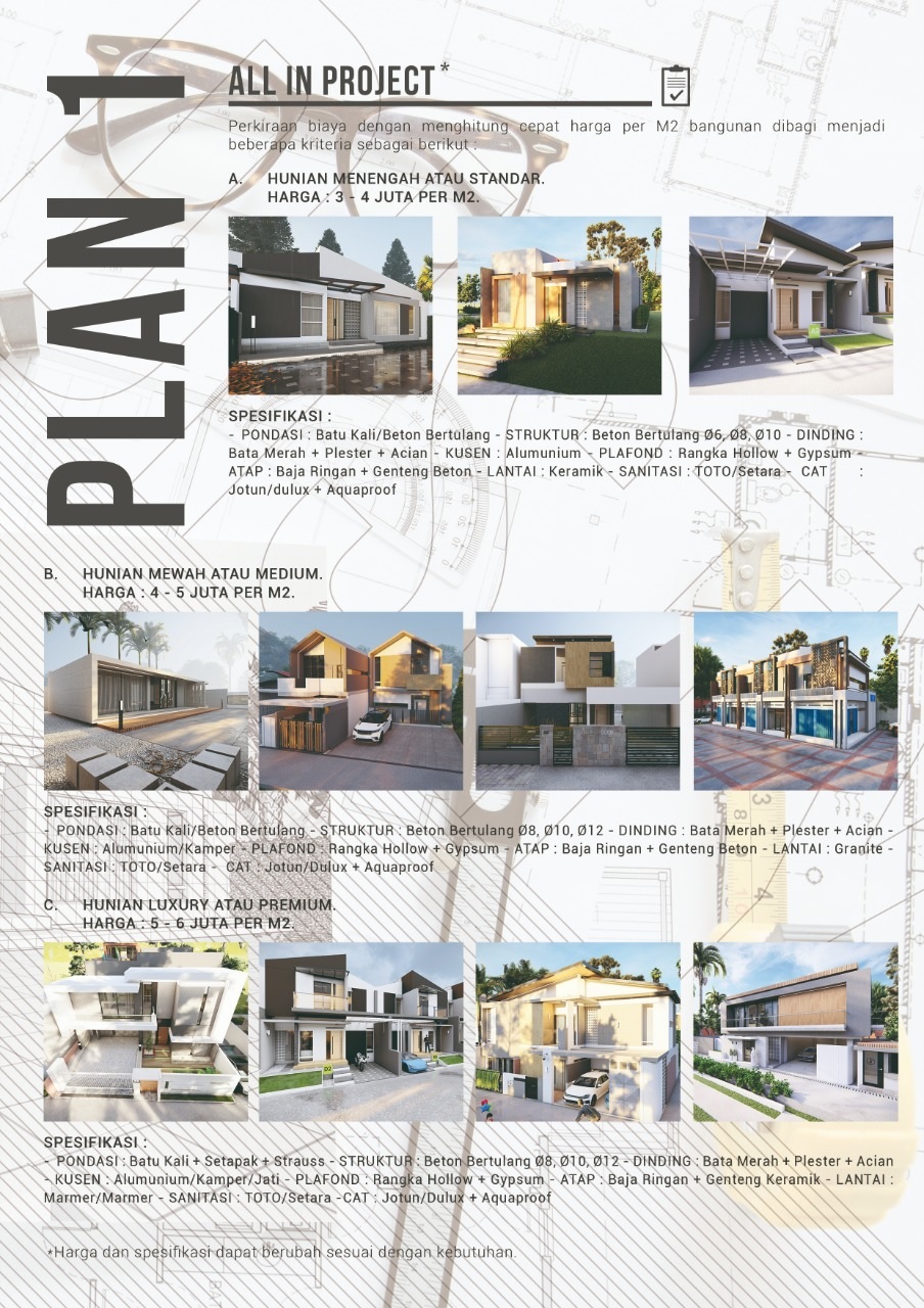 Konsultasi / perencanaan / arsitek desain / gambar kerja / perhitungan RAB / site plan promosi. - Konstruksi :