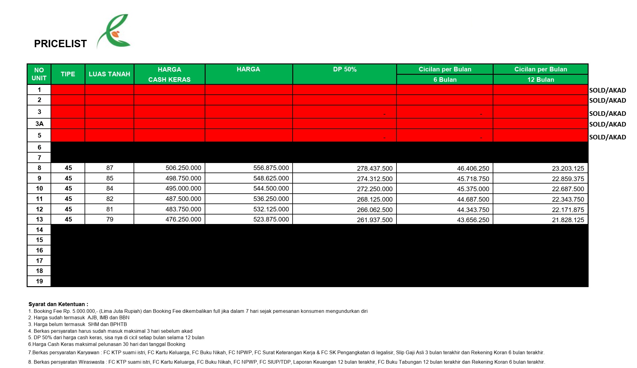 Seperti proyek-proyek sebelumnya, Developer hanya memasarkan proyeknya dengan skema cash keras atau bertahap. Unit yang dipasarkan kali ini masih tersedia untuk tipe 45.