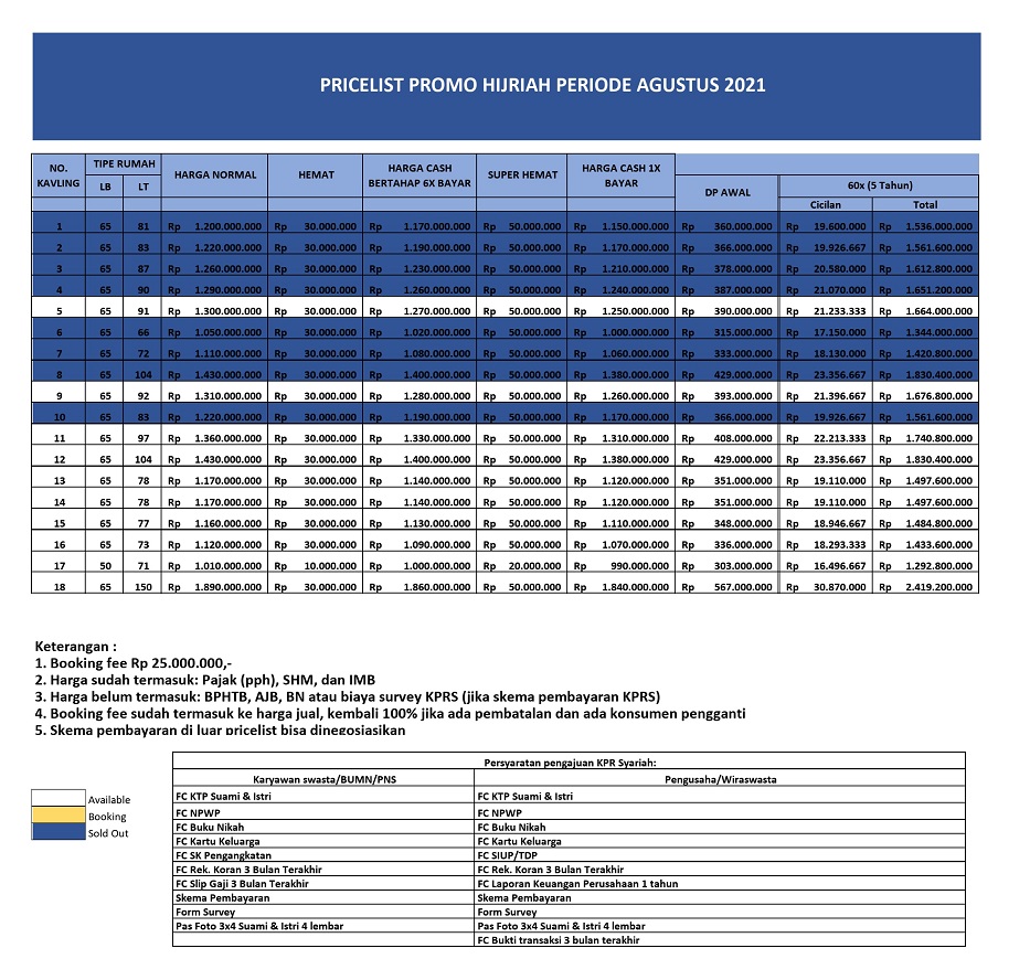 Semua unit dipasarkan dengan tipe 65 dengan luas tanah bervariasi. Unit yang masih tersedia hanya 10 unit saja.