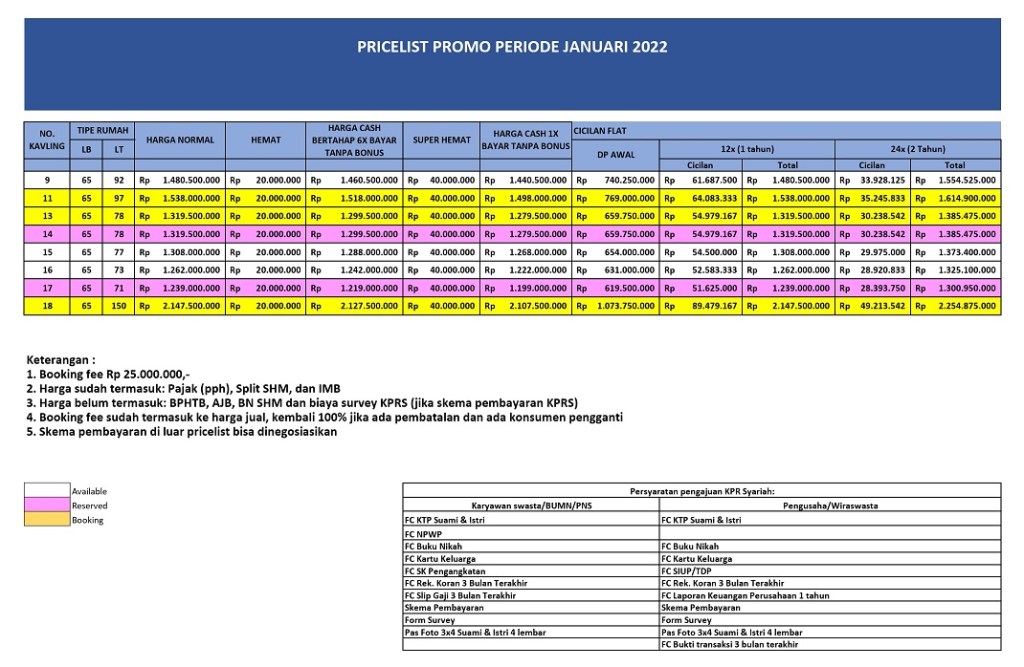 Daftar harga di atas adalah untuk tipe 65, yang bisa request menjadi tipe 45.