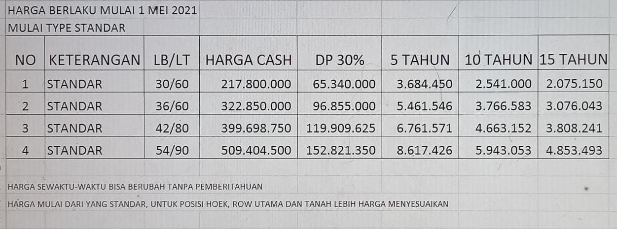 Developer memberikan penawaran menarik, yaitu bisa KPR langsung ke Developer tanpa harus melalui BI Checking. Berikut daftar harga unit yang dipasarkan :