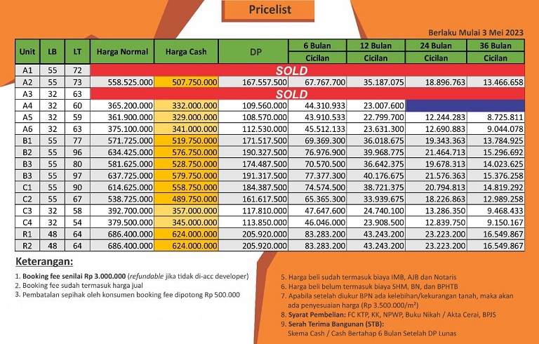 Tipe 32/60 dipasarkan mulai 361 juta, harga cash jadi 329 juta.