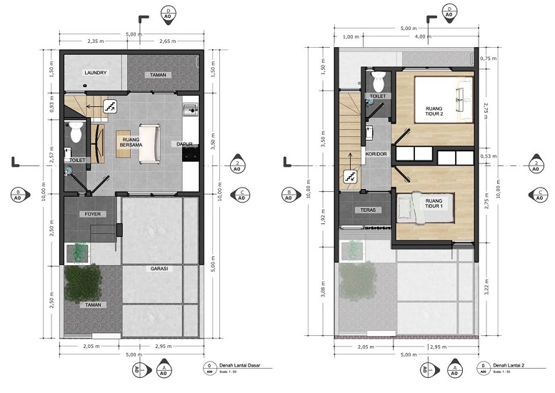 Gambar di atas adalah denah ruangan tipe 50 (2 lantai) dengan :