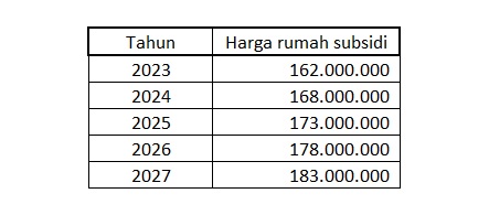 Jika harga rumah subsidi rata-rata per tahunnya mengalami kenaikan 5 juta, maka tahun 2027 harga rumah subsidi sekitar 183 juta.