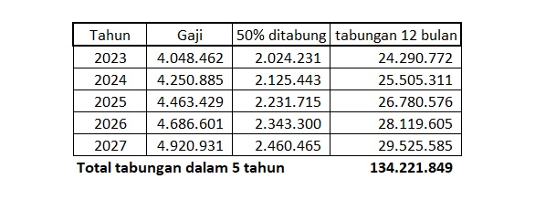 Pda 2 tabel di atas, jika kenaikan gaji UMR setiap tahun adalah 5%, dan ditabung 50% setiap bulannya maka dalam waktu 5 tahun sudah memiliki tabungan sebesar 134 juta.