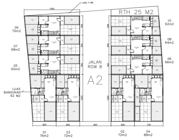 Gambar di atas merupakan site plan pada salah satu blok di posisi depan dari perumahan. Blok tersebut khusus unit 2 lantai dengan tipe 50 dan 60 dengan row jalan 8 meter.