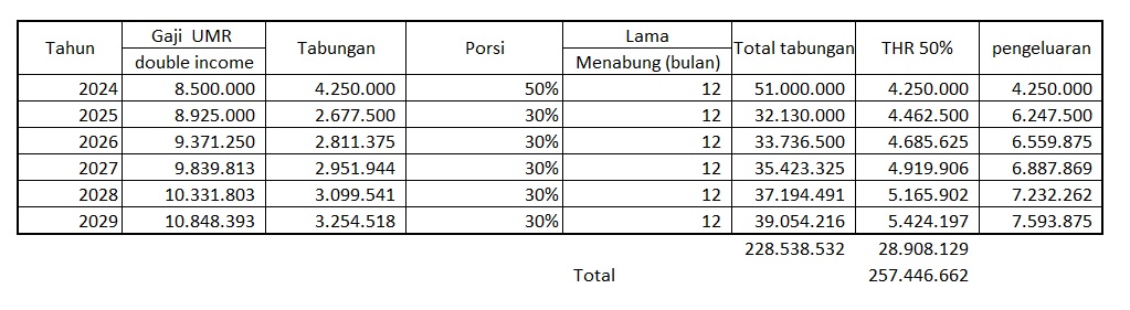 Hasil akhir perhitungan, dengan tekad yang kuat, Double Income dengan penghasilan UMR dalam waktu 5 tahun, jumlah tabungannya mencapai 257 jutaan. Nominal tersebut bisa digunakan untuk membeli rumah impian sekelas rumah subsidi.
