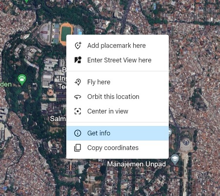- Setelah mendapatkan titik lokasi yang diinginkan, “klik kanan” lalu pilih “info”