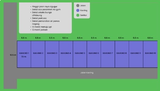 Memiliki tanah kavling memiliki beberapa keuntungan. Salah satu keuntungannya adalah kavling bisa dibangun kapan saja dan rumah bisa dibangun sesuai dengan desain sendiri. Owner memasarkan kavling dengan luas 68 m2 (10,5 x 6,5) dengan total 10 unit kavling. Lokasi kavling berada di pinggir jalan raya Cigugur yang lokasinya dekat ke temoat wisata Lembang Park Zoo. Harga yang dipasarkan adalah harga perdana dengan harga 3,7 juta/m2.