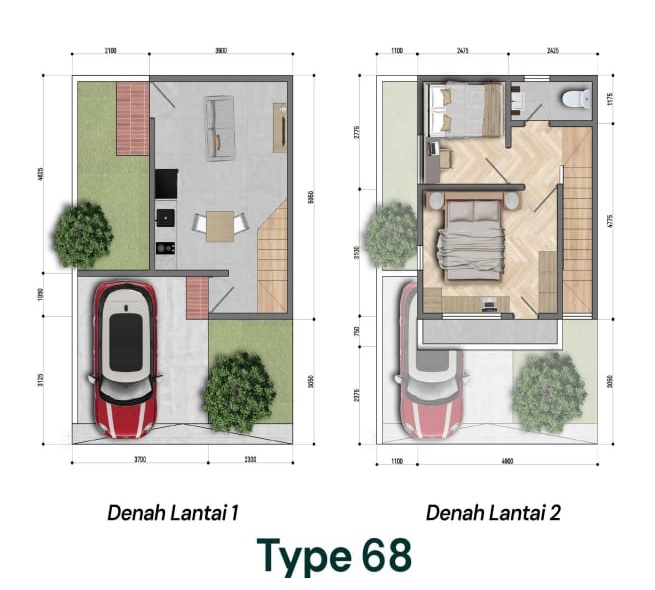 Unit yang dipasarkan ada 2 tipe yang semuanya adalah bangunan 2 lantai, salah satunya adalah tipe 68 dengan 2 kamar tidur dan 1 kamar mandi. Lantai 1 merupakan ruangan open space yang cukup luas dengan ukuran 3,9 m x 5,95 m. Ruang tamu, ruang keluarga dan dapur menjadi 1 di lantai 1, serta menyisakan 2 ruang teras (teras depan dan teras samping). Teras samping bisa digunakan sebagai ruangan serbaguna, misalnya ruang cuci dan jemur pakaian sekaligus menjadi tempat santai terbuka yang dapat menghirup langsung udara pegunungan yang segar.