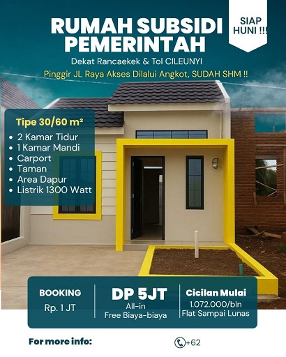 Miliki rumah subsidi dengan DP 5 juta (all in) dan cicilan 1 jutaan (flatt) serta sudah tersedia dapur (meja dapur+kitchen sink).