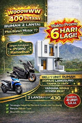 Beli rumah 2 lantai di Cimahi Utara, langsung dapat hadiah motor tanpa diundi yang berlaku hanya untuk 4 unit saja. Promo ini berlaku selama bulan Ramadhan tahun ini.